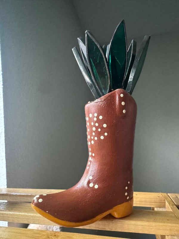 Teal waterglass stainedglass agave in a burnt sienna cowgirl boot planter. 3" wide, 5" tall